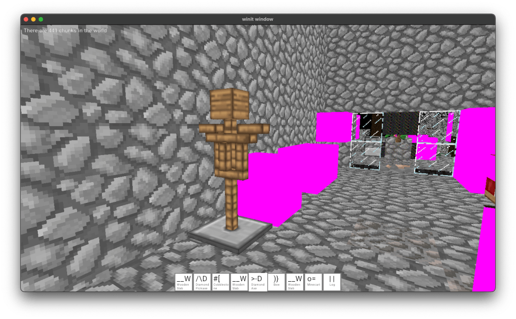 Starting over hurt, but progress was initially blistering. The first milestone was rendering: getting blocks and textures on-screen. Early on, we had something rudimentary—blocks without proper lighting and some textures with white backgrounds due to missing transparency support—but it was a fast start.
